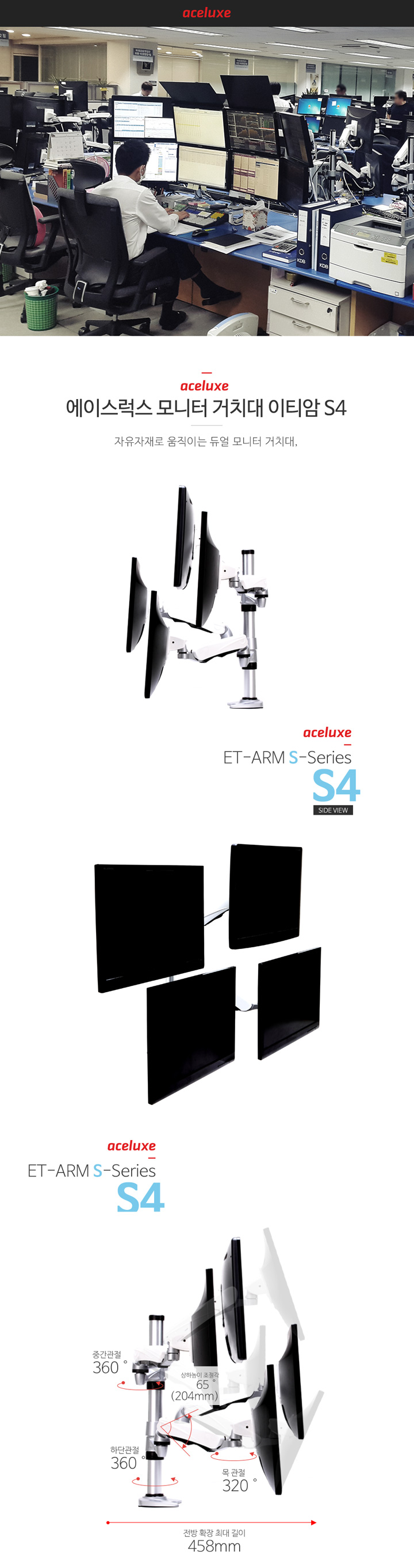 파이프형 쿼드모니터 거치대입니다. 일반 플라스틱 보다 스크래치 및 충격과 열에 강한 ABS소재를 사용하였습니다. 4개의 모니터를 자유롭게 사용하실 수 있습니다. 자유로운 가로 360도 회전(스위블)과 높이조절(리프트)이 용이한 상품이며, 심플한 곡선형 디자인으로 세련되고 어떤 환경에도 잘 어울리는 상품입니다.